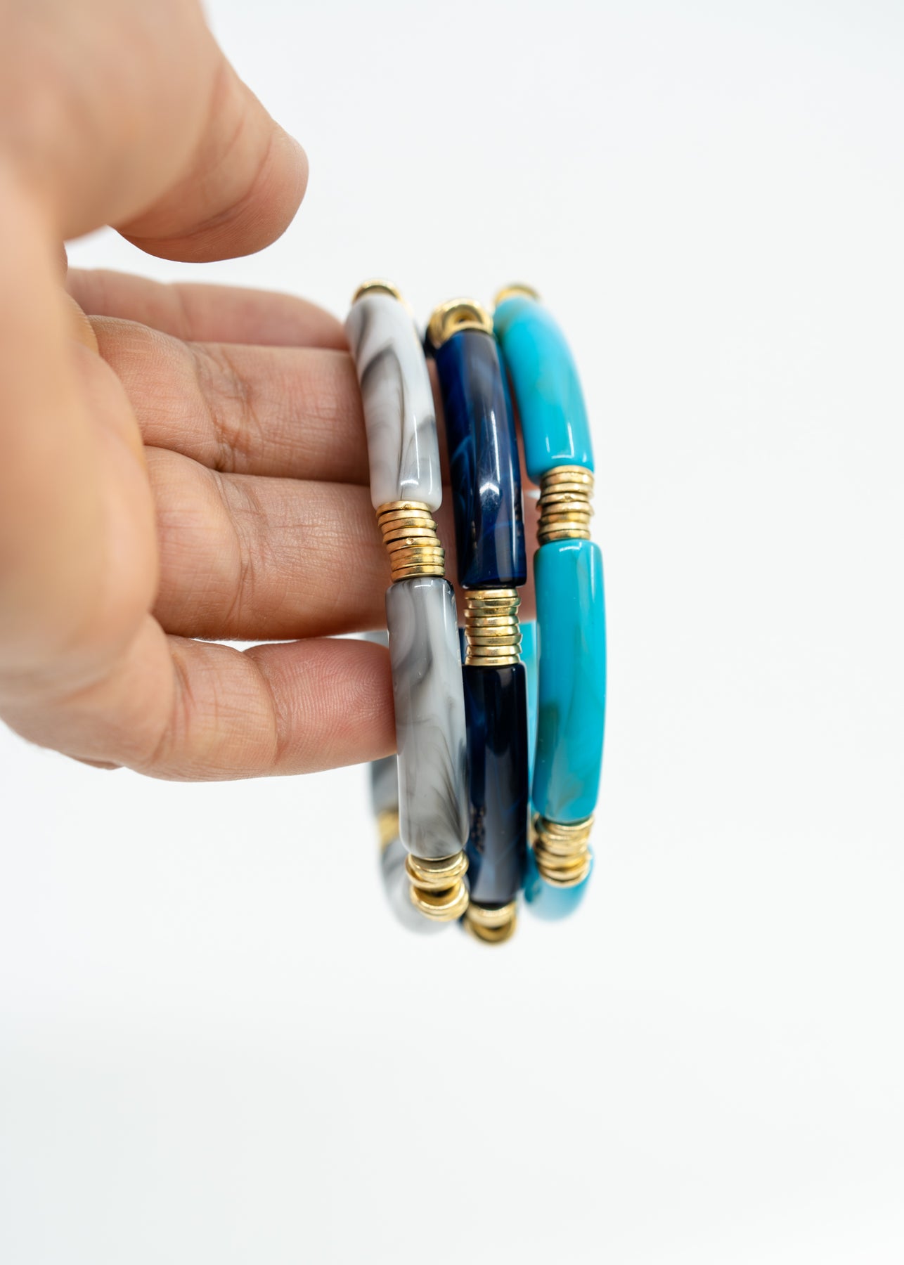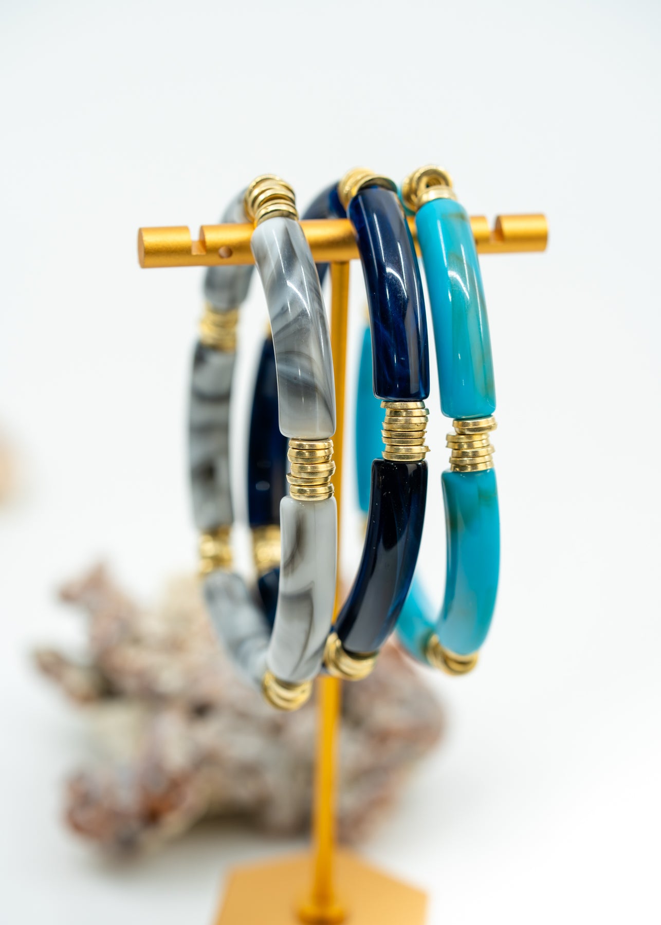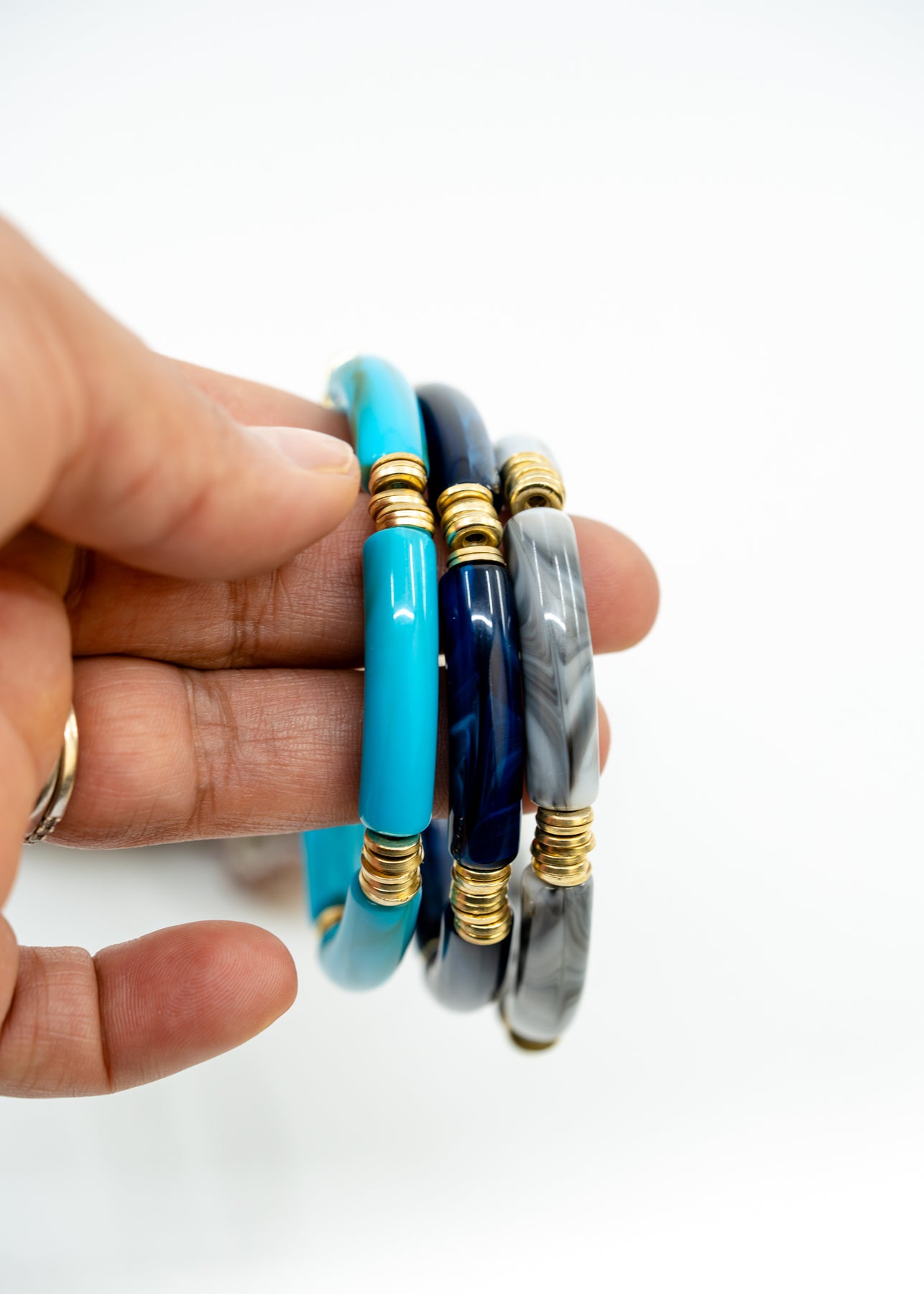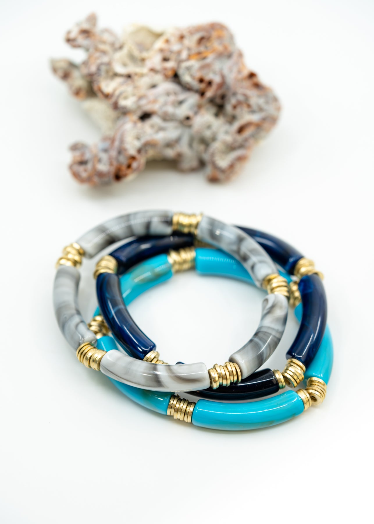 Josie: Set of 3 Blue and Gray Acrylic Tube Bracelets, Acrylic Bracelet Stack, Lucite Stretchy Bracelet, Bangles, Waterproof Jewelry, Gifts for Her