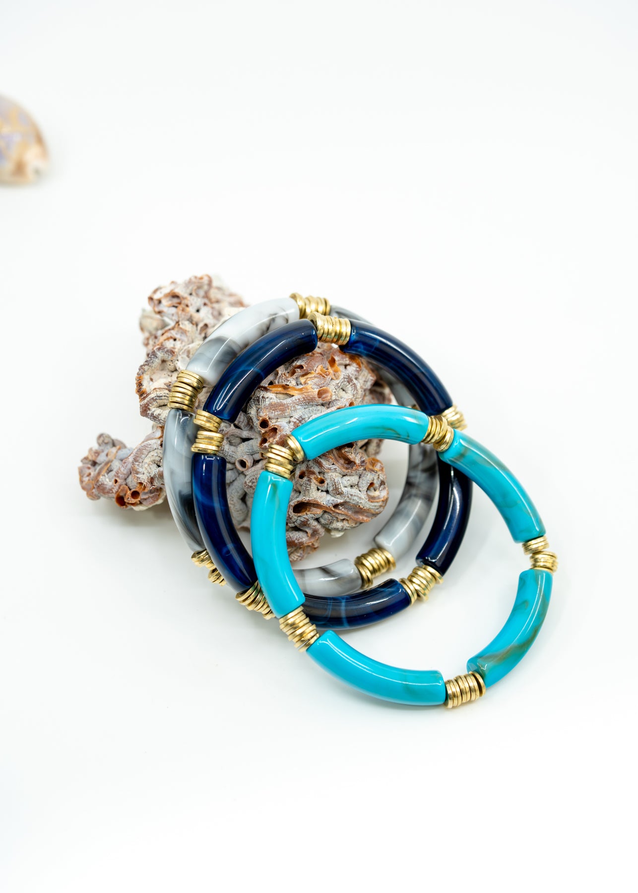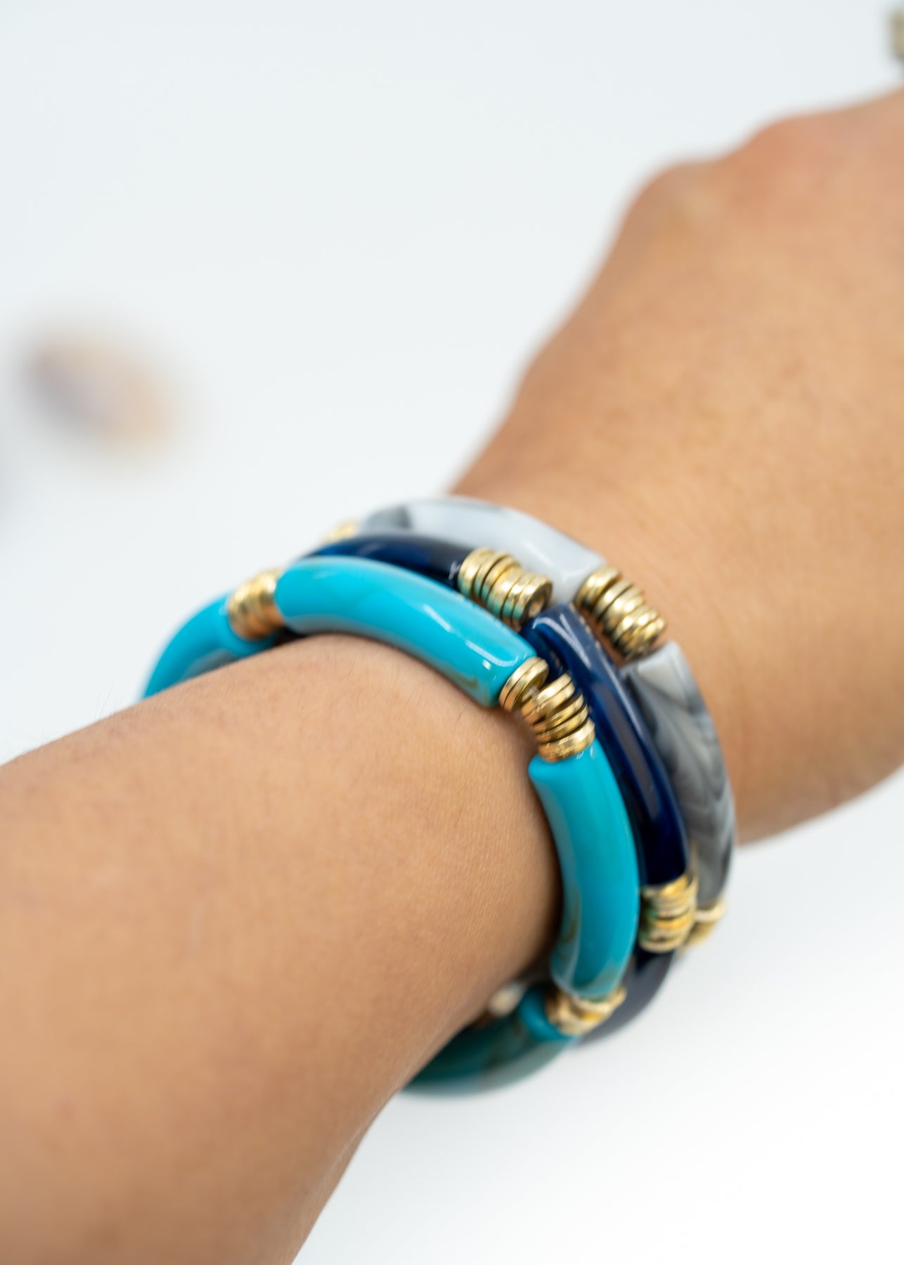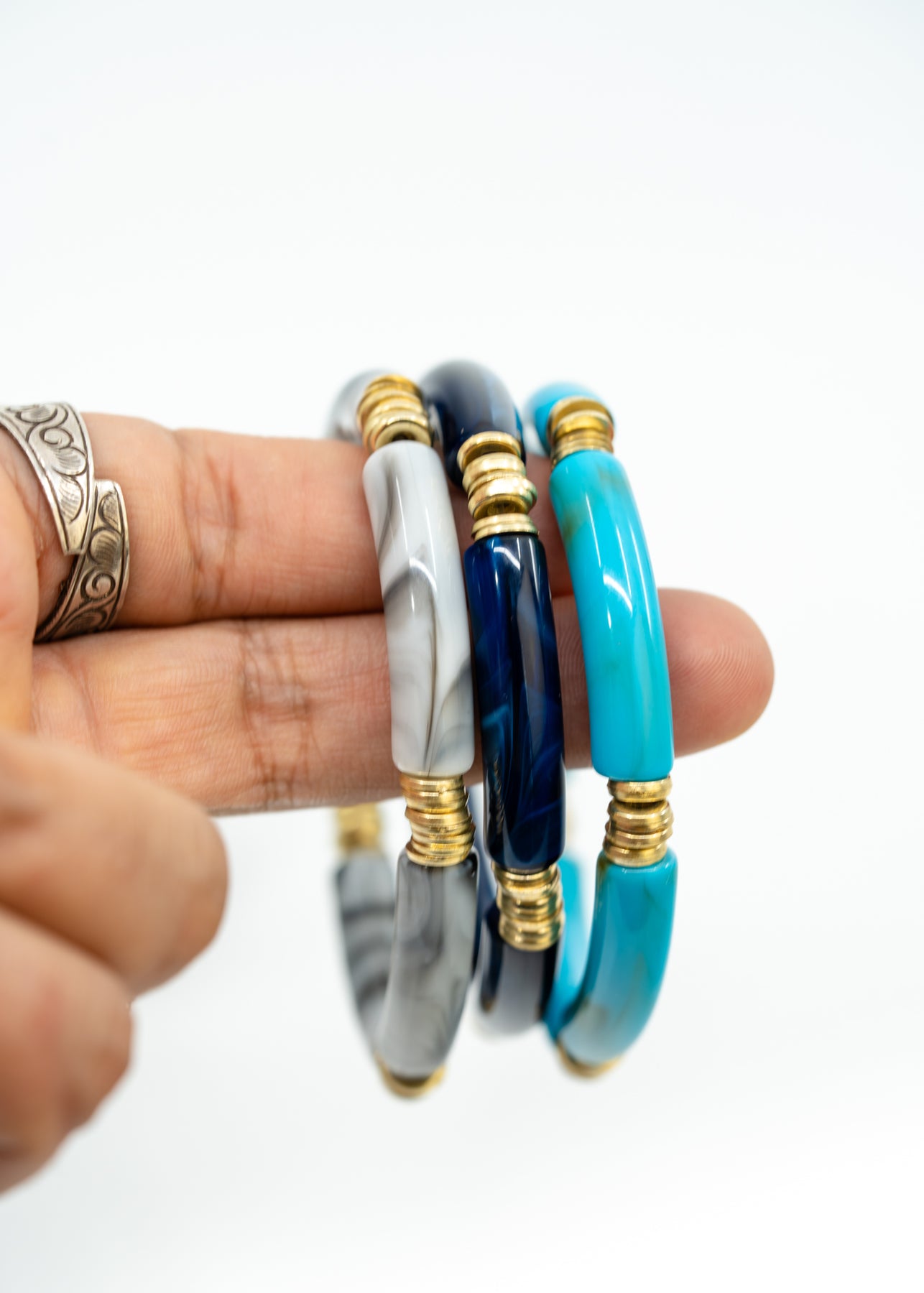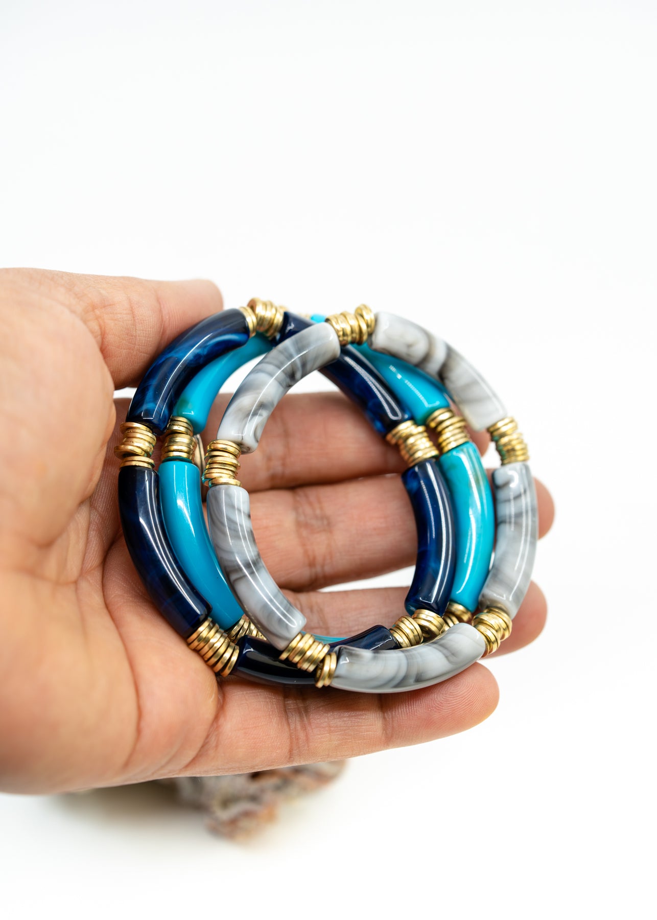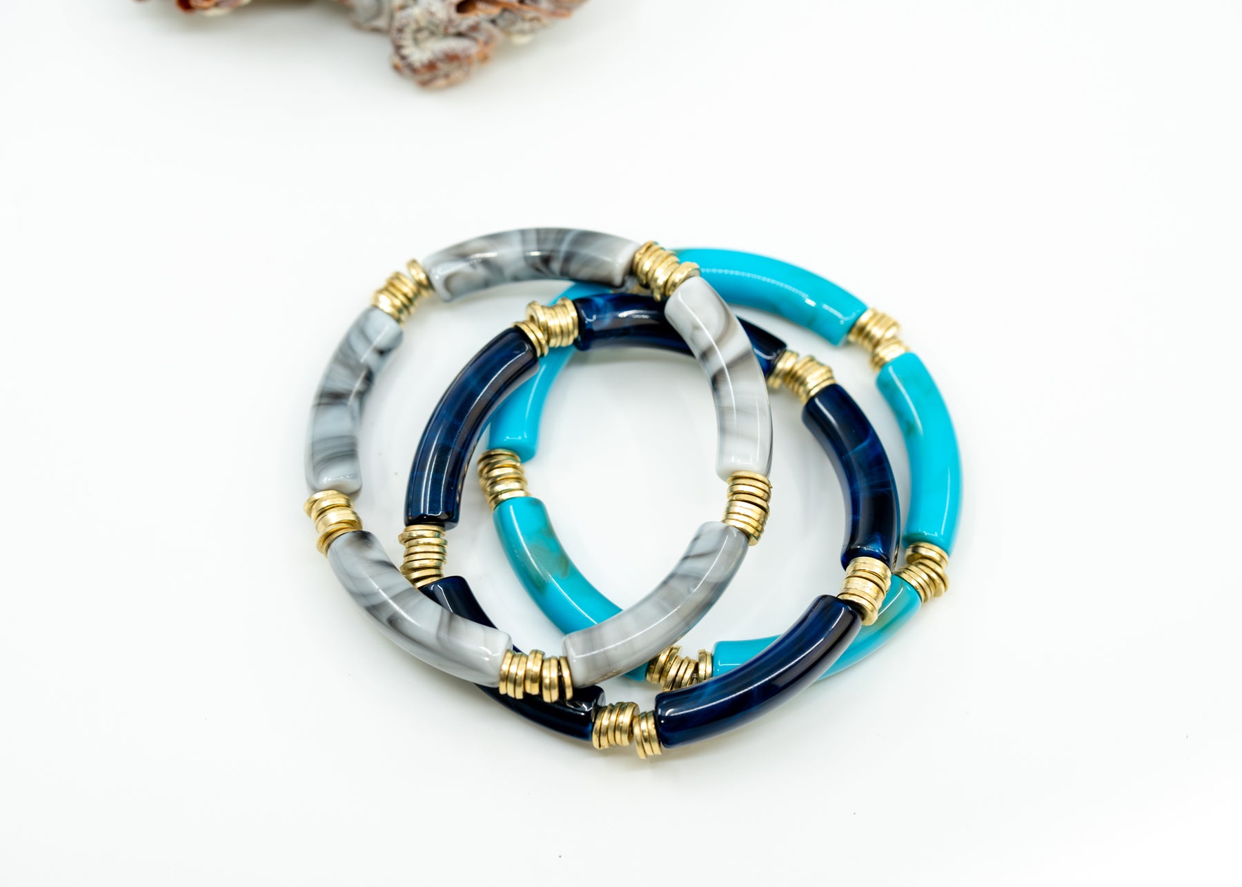 Josie: Set of 3 Blue and Gray Acrylic Tube Bracelets, Acrylic Bracelet Stack, Lucite Stretchy Bracelet, Bangles, Waterproof Jewelry, Gifts for Her