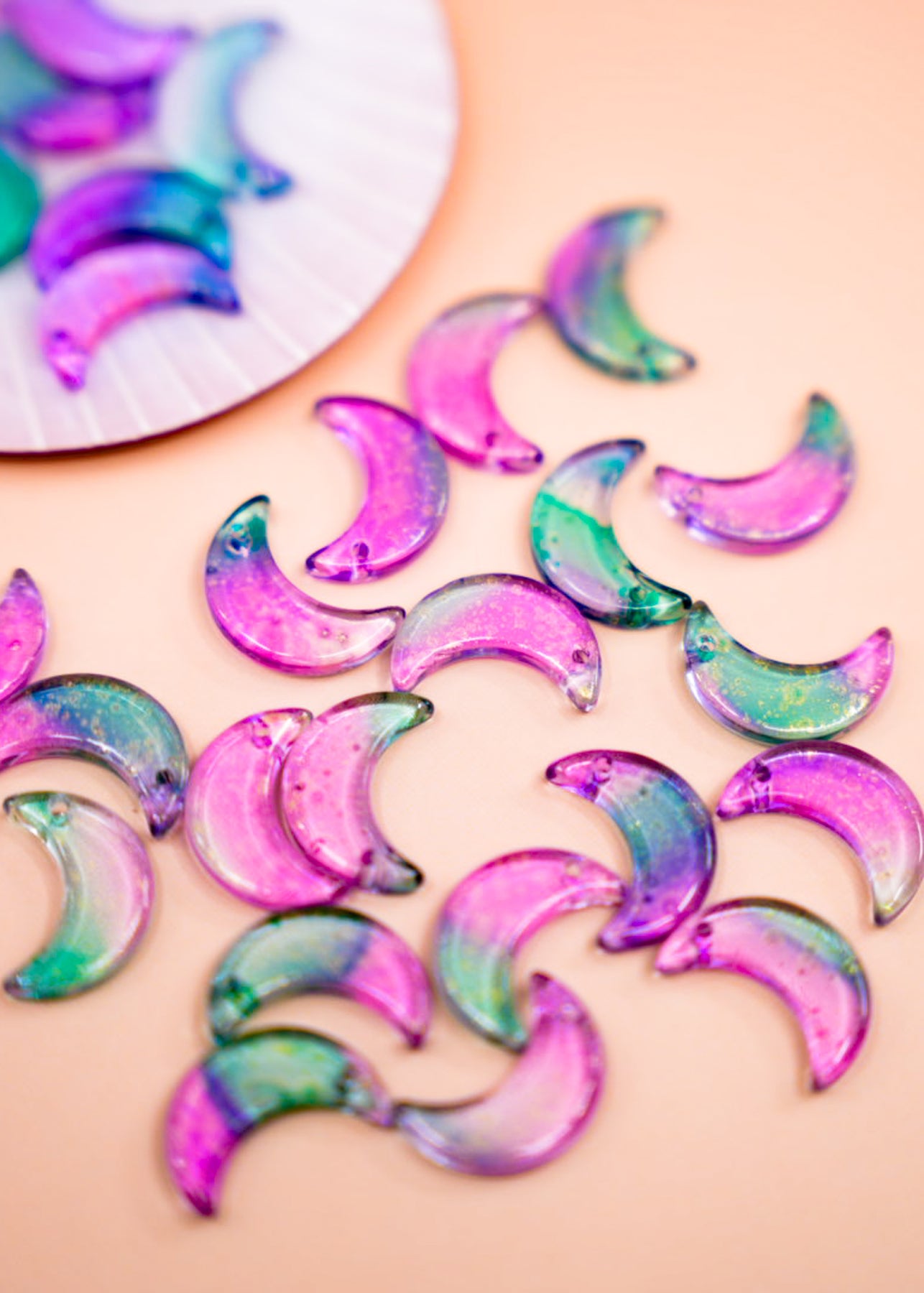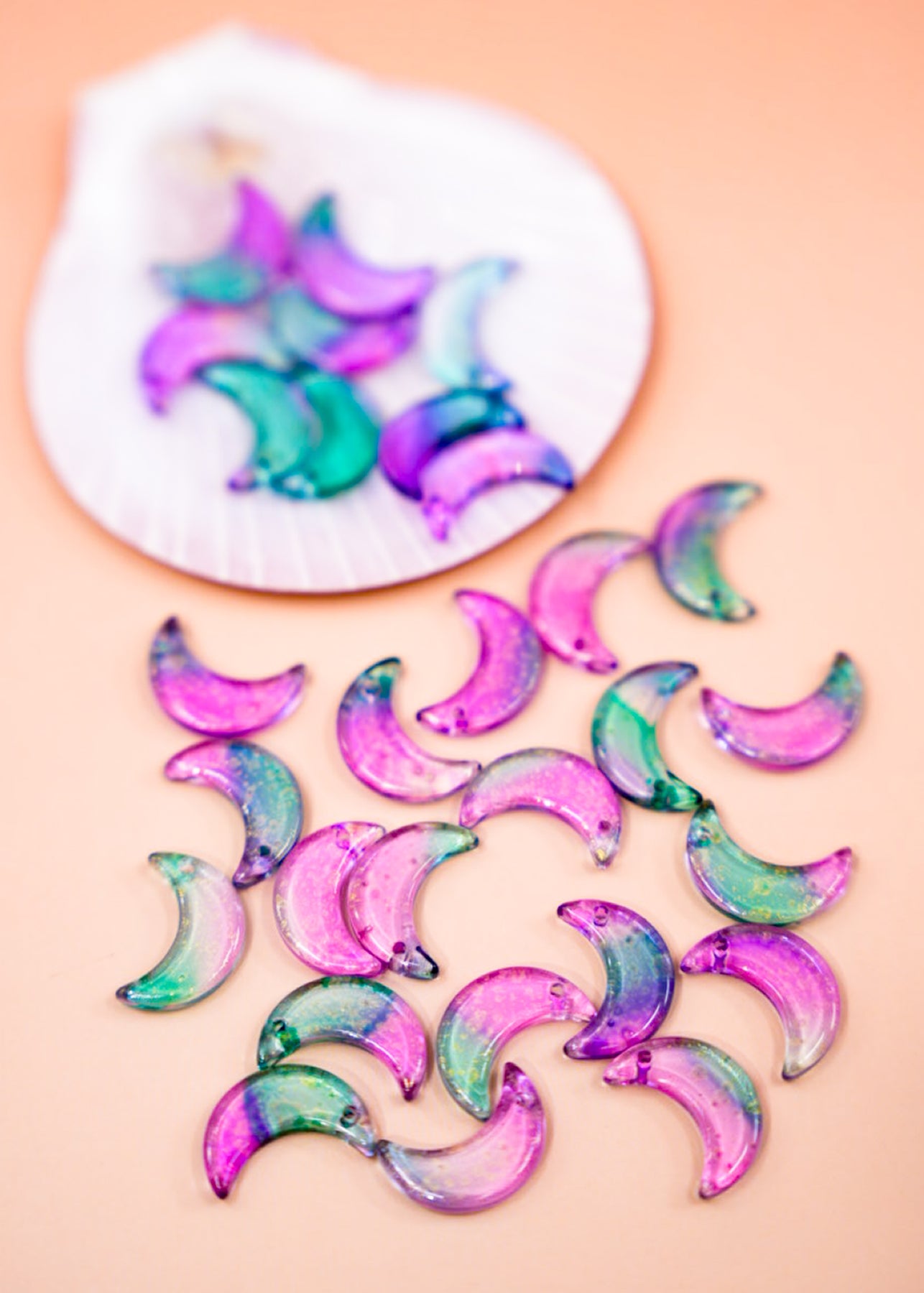 Add celestial magic to your jewelry creations with these Pink and Green Half Moon Glass Charms, shimmering with delicate gold dust accents. Each charm is crafted from transparent glass in two-tone pink and green, creating an ethereal glow that’s perfect for moon-inspired jewelry designs.