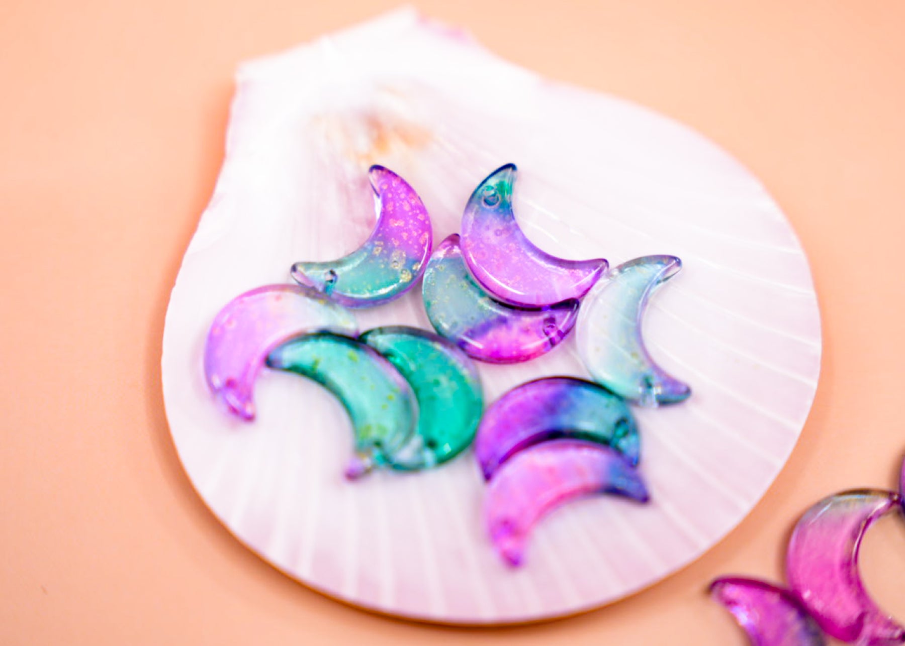 Pink and Green Half Moon Charms with Gold Dust – 16x10mm Glass Moon Pendants | Set of 10 Charms | Celestial Jewelry Supplies