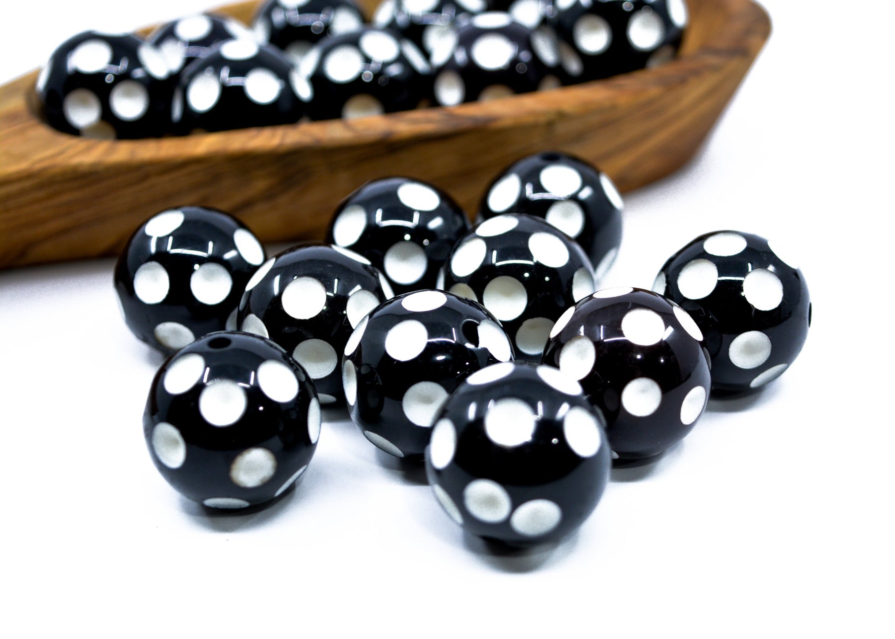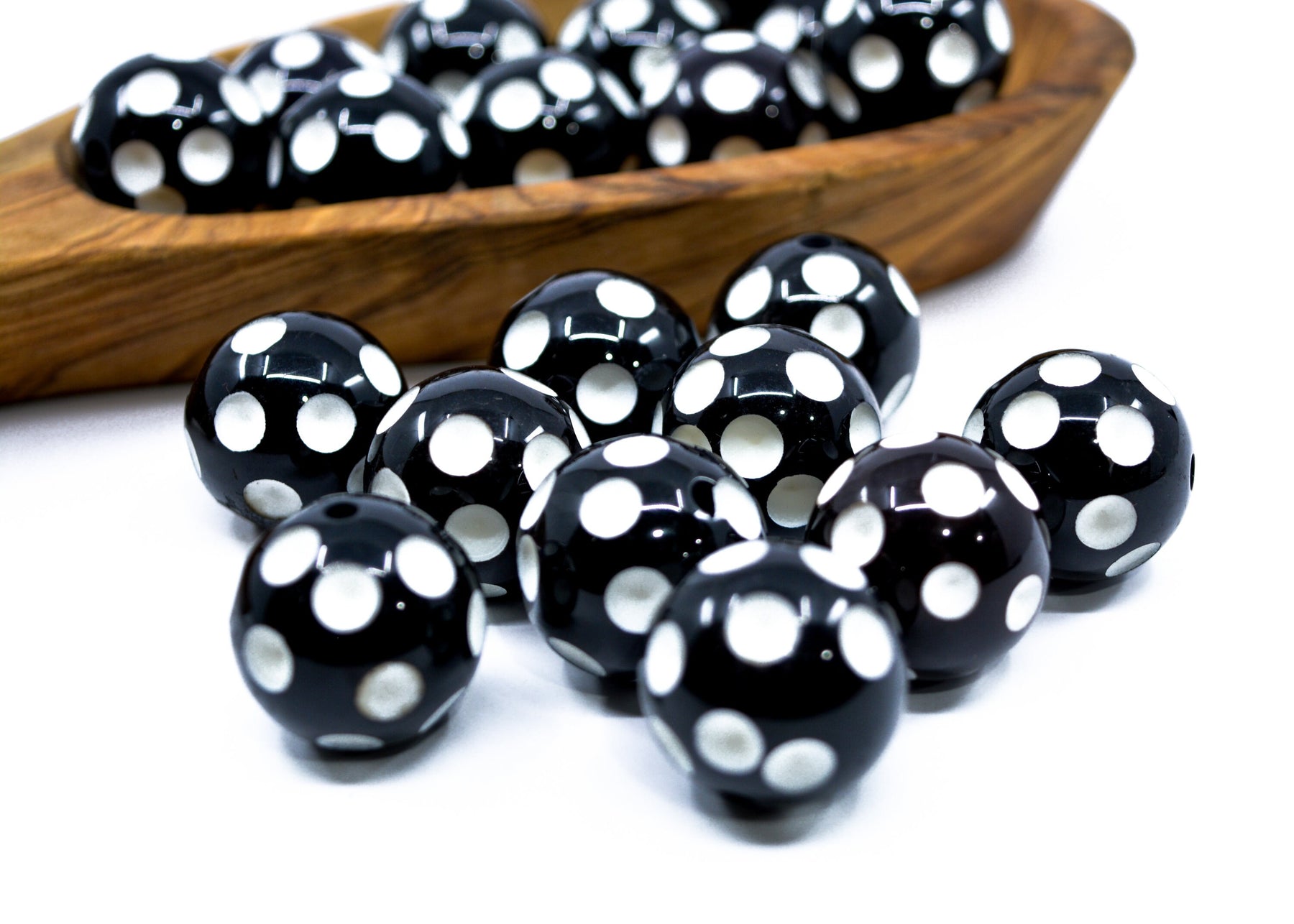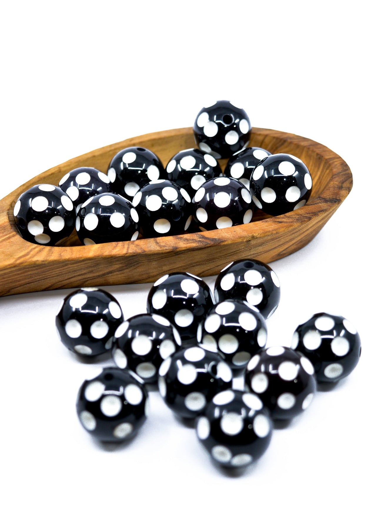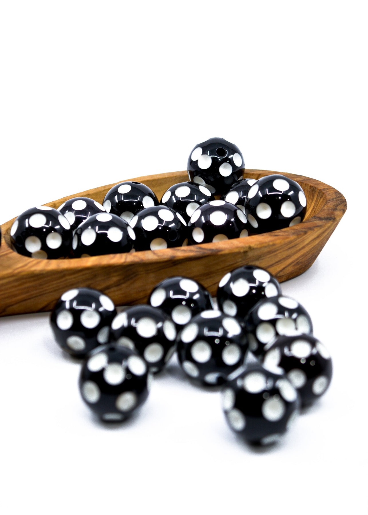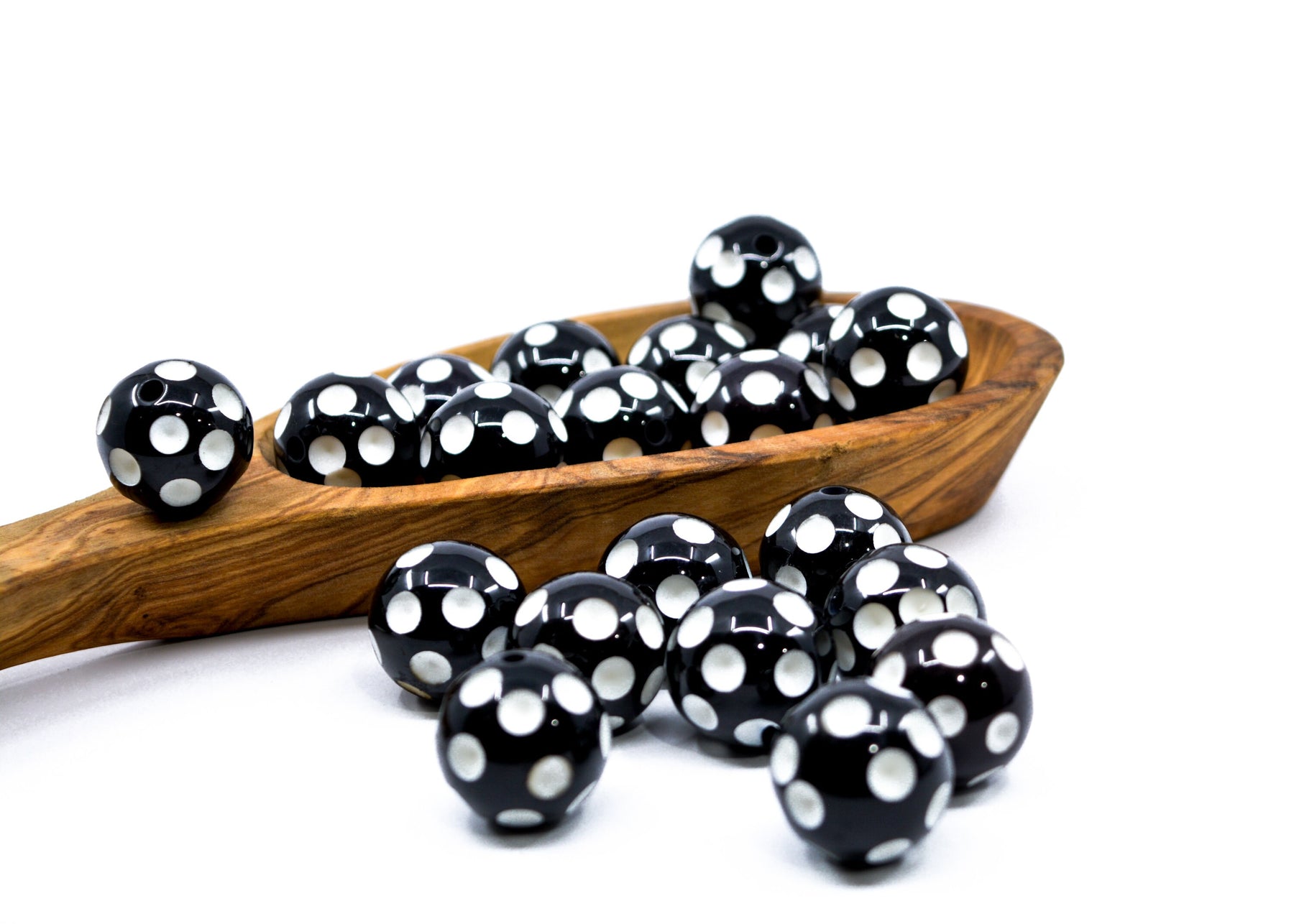 These are super fun designs, big yet super lightweight beads. In our vast amount of inventory, these have been in our collection for nearly 10 years now. The design is super fun, with white dots that have been carved out from the black beads. Perfect for jewelry making and all sorts of crafts, truly. The beads are 14mm in diameter and 15mm tall with a 2.5mm hole, perfect to string in thicker cording.