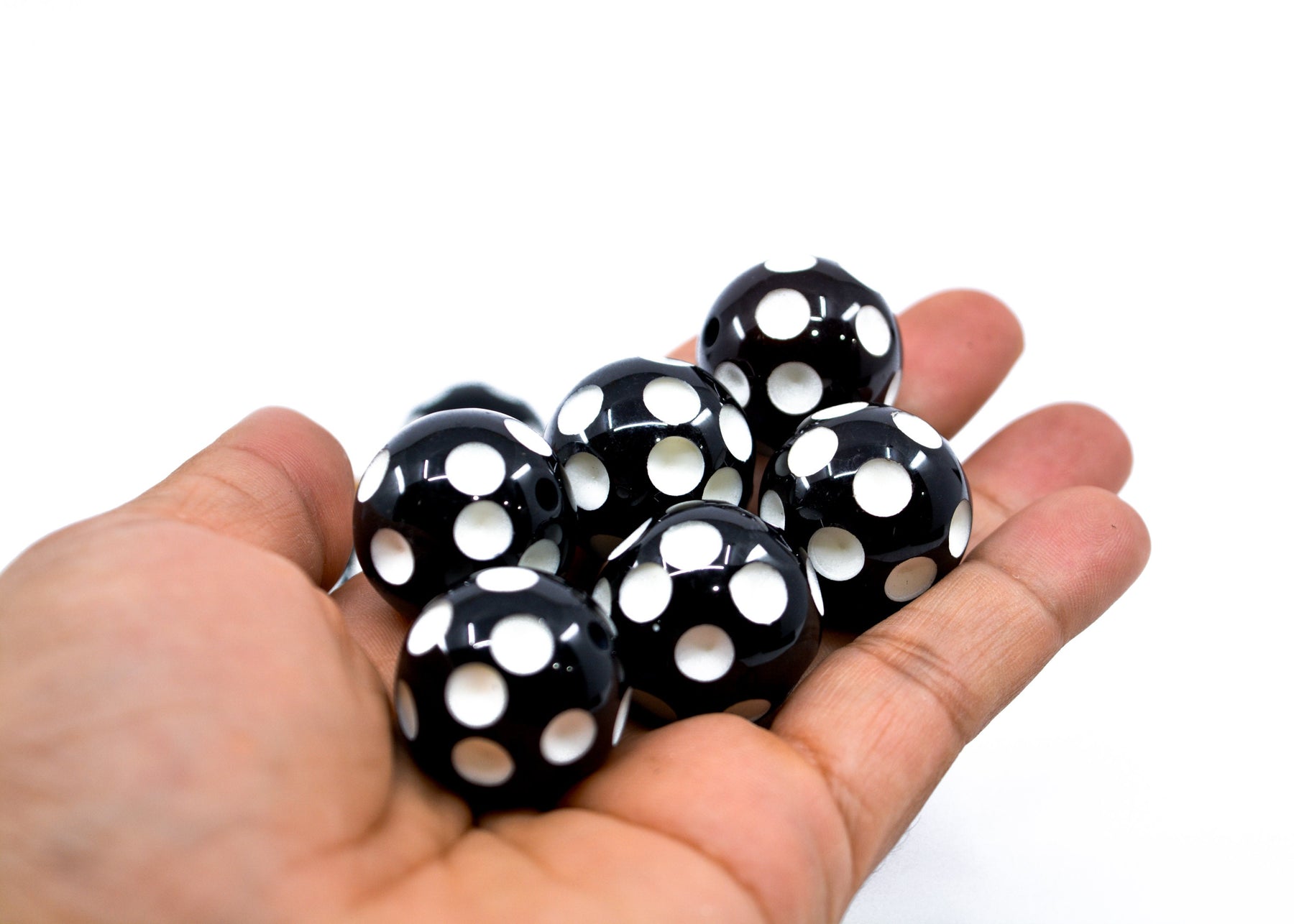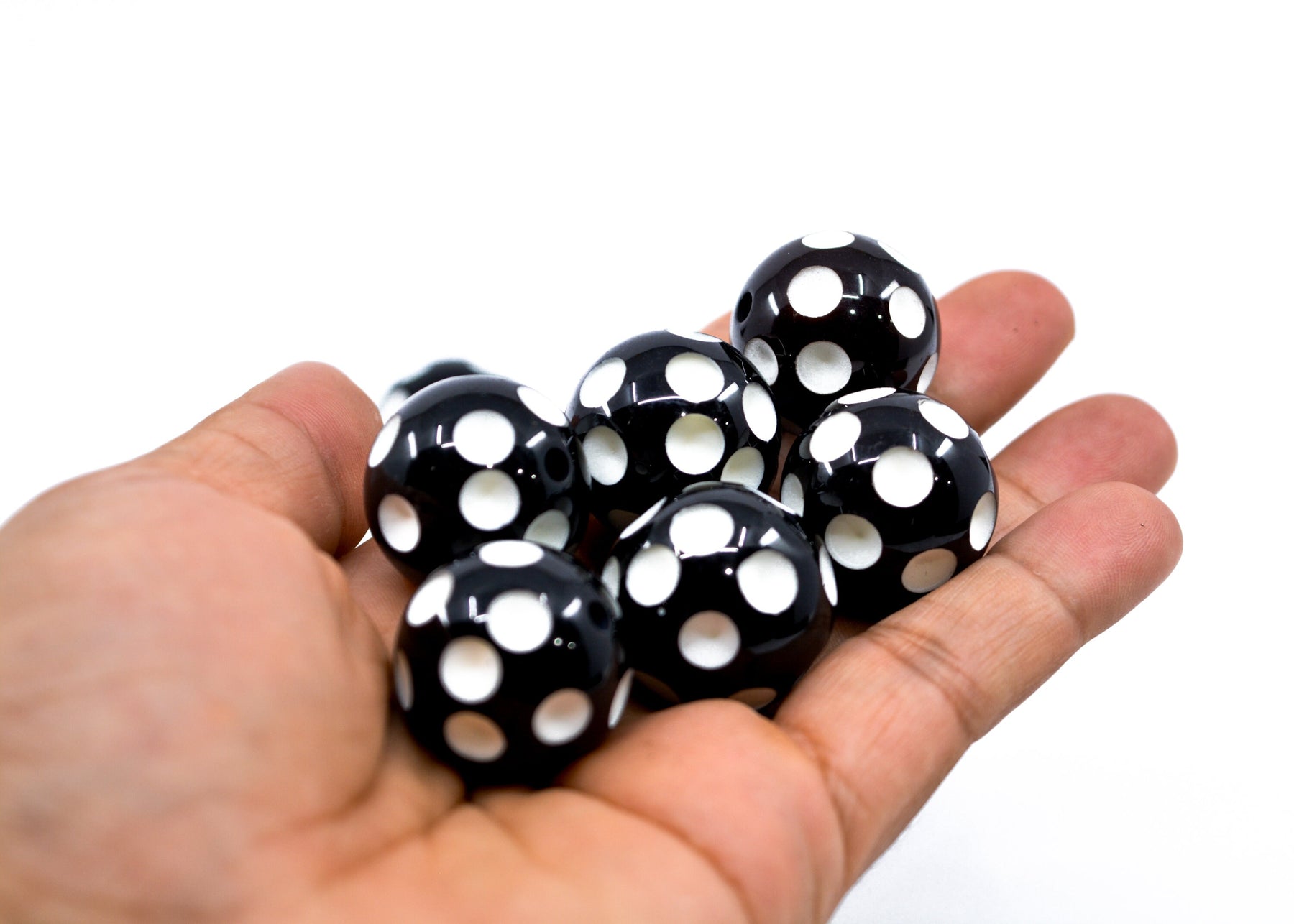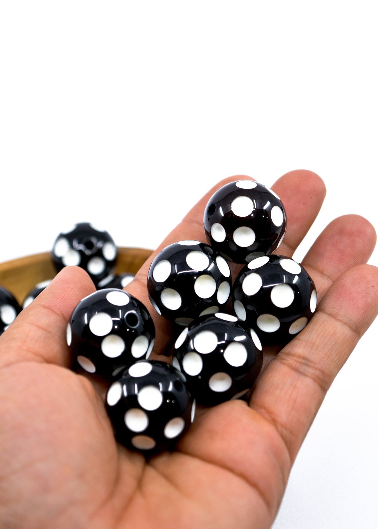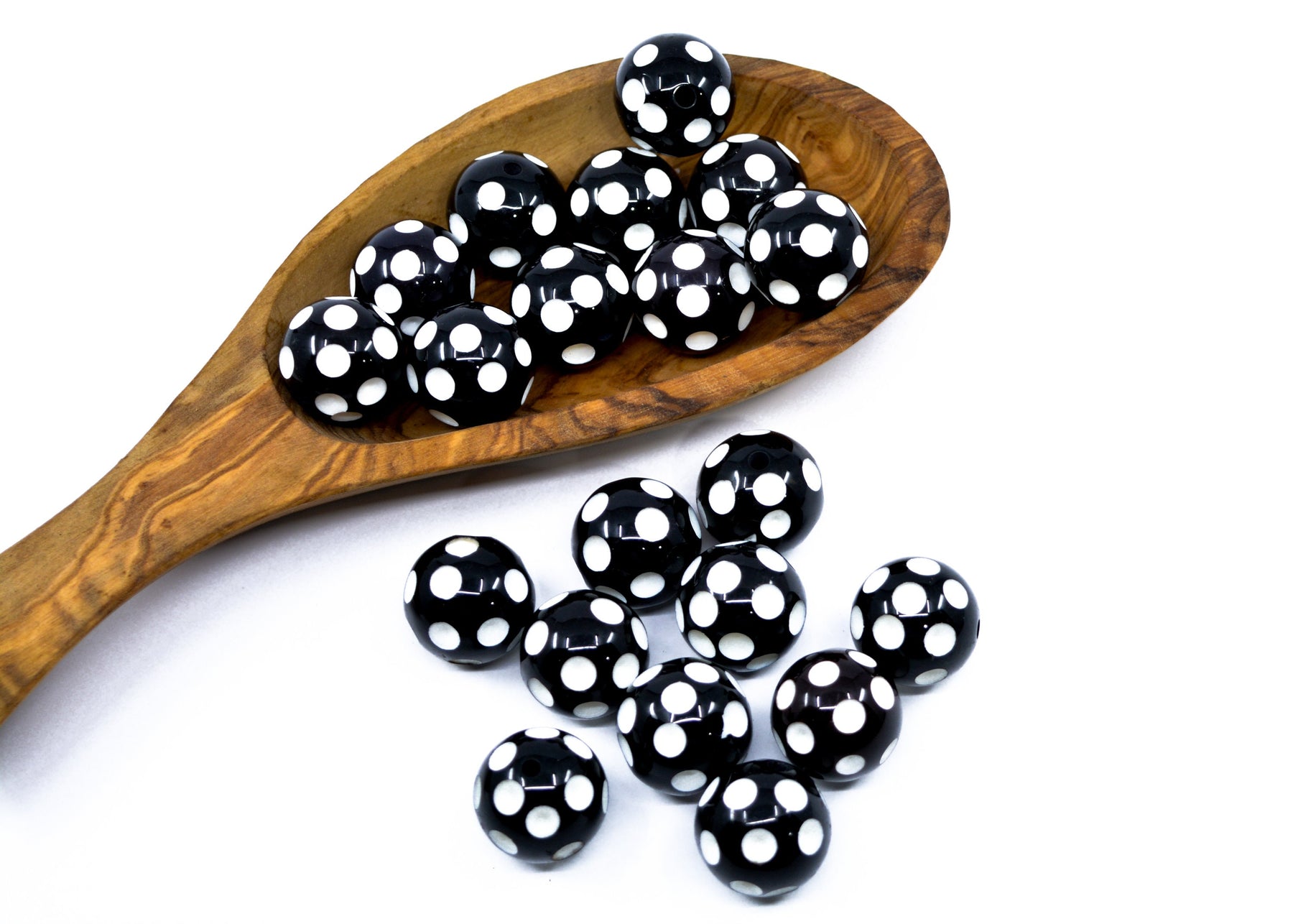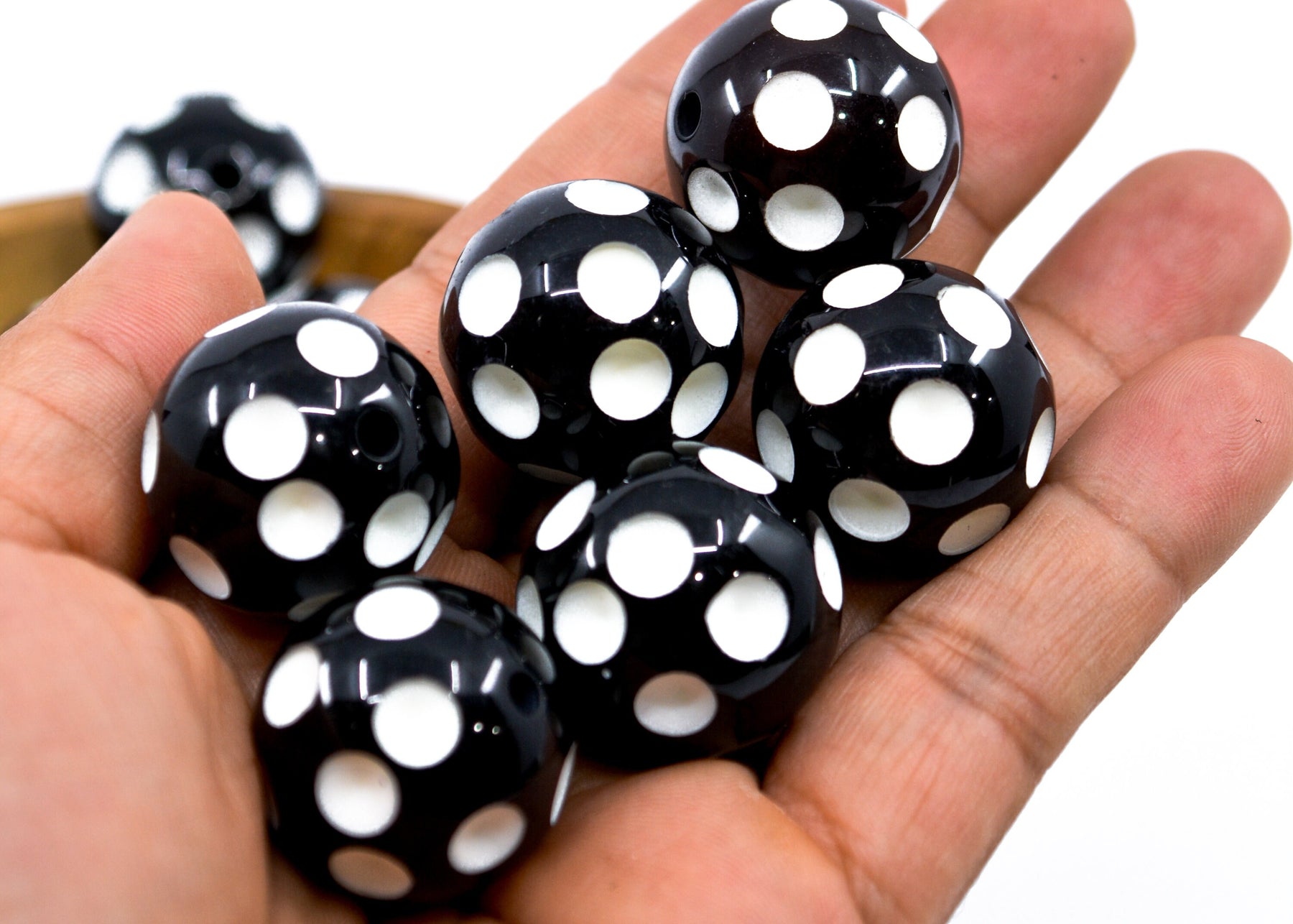 These are super fun designs, big yet super lightweight beads. In our vast amount of inventory, these have been in our collection for nearly 10 years now. The design is super fun, with white dots that have been carved out from the black beads. Perfect for jewelry making and all sorts of crafts, truly. The beads are 14mm in diameter and 15mm tall with a 2.5mm hole, perfect to string in thicker cording.