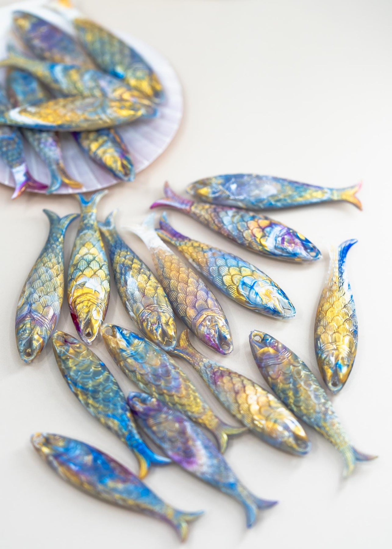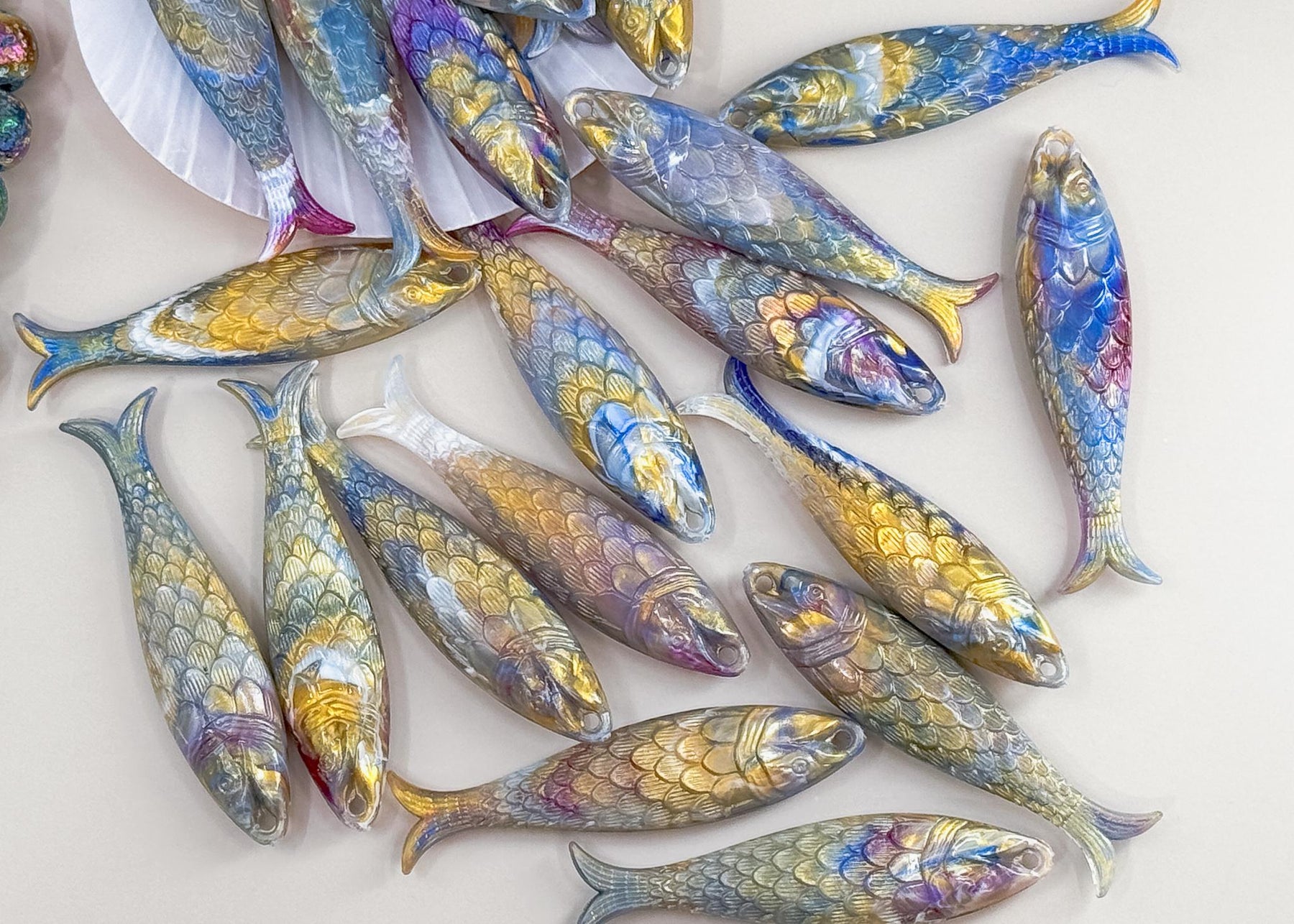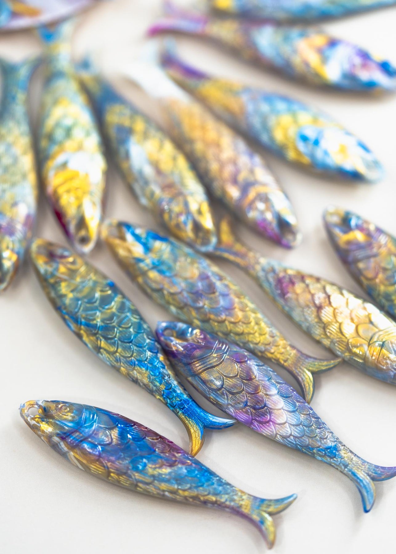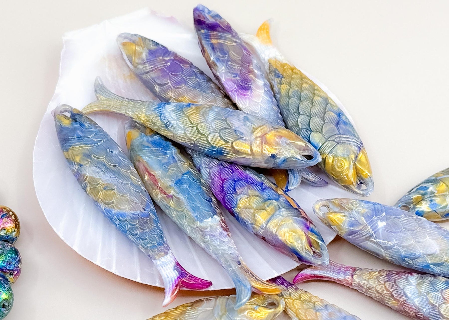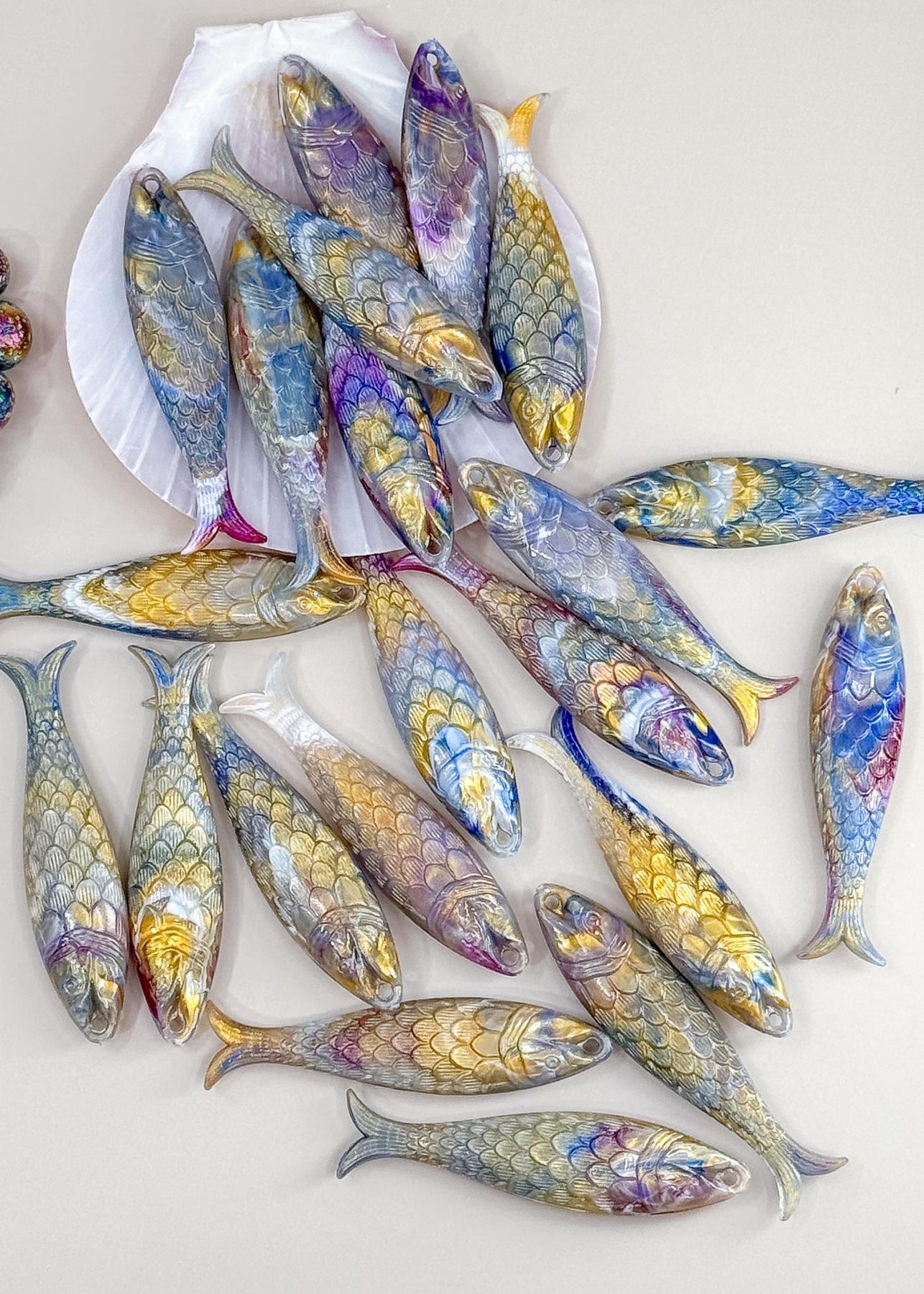 ❁ Product Details: * Quantity: 1 fish charm * Size: 48mm (approx. 1.9″) * Hole Size: ~1mm * Material: High-quality resin * Color: Swirls of purple, gold, and blue * Origin: Made in Germany