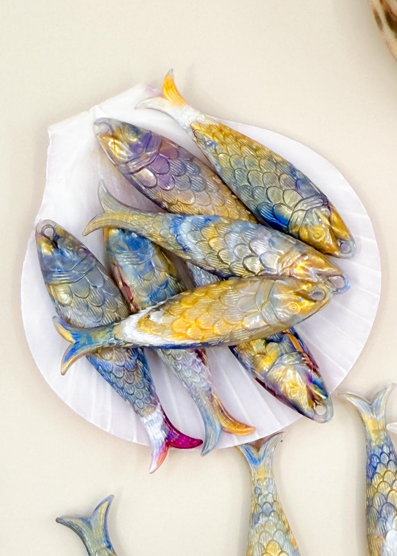 A dreamy ocean meets the cosmos. This shimmering galaxy fish charm is a little piece of stardust and sea-crafted from marbled resin that swirls deep purple, rich gold, and cosmic blue into a one-of-a-kind aquatic talisman. At 48mm long, it's big enough to make a statement but light enough for effortless wear.