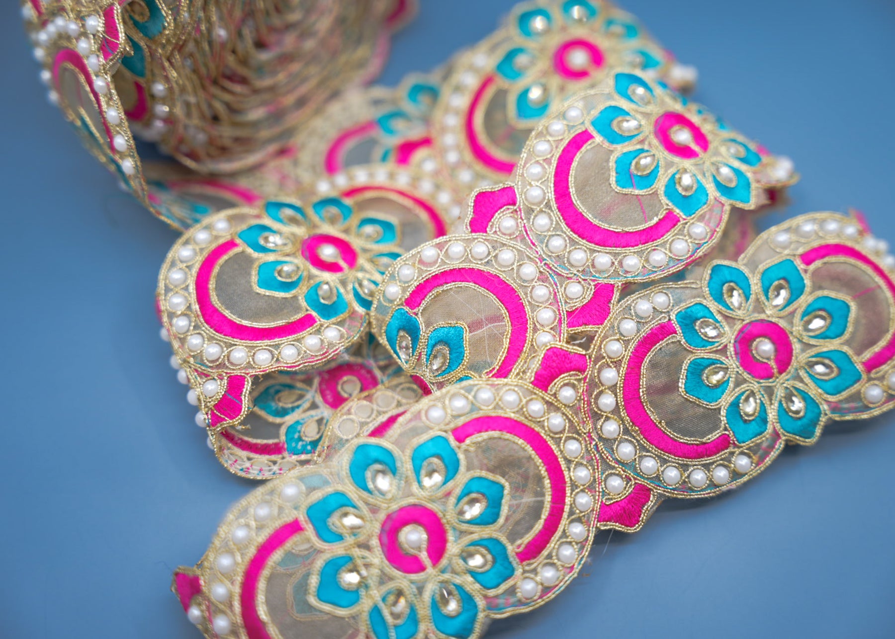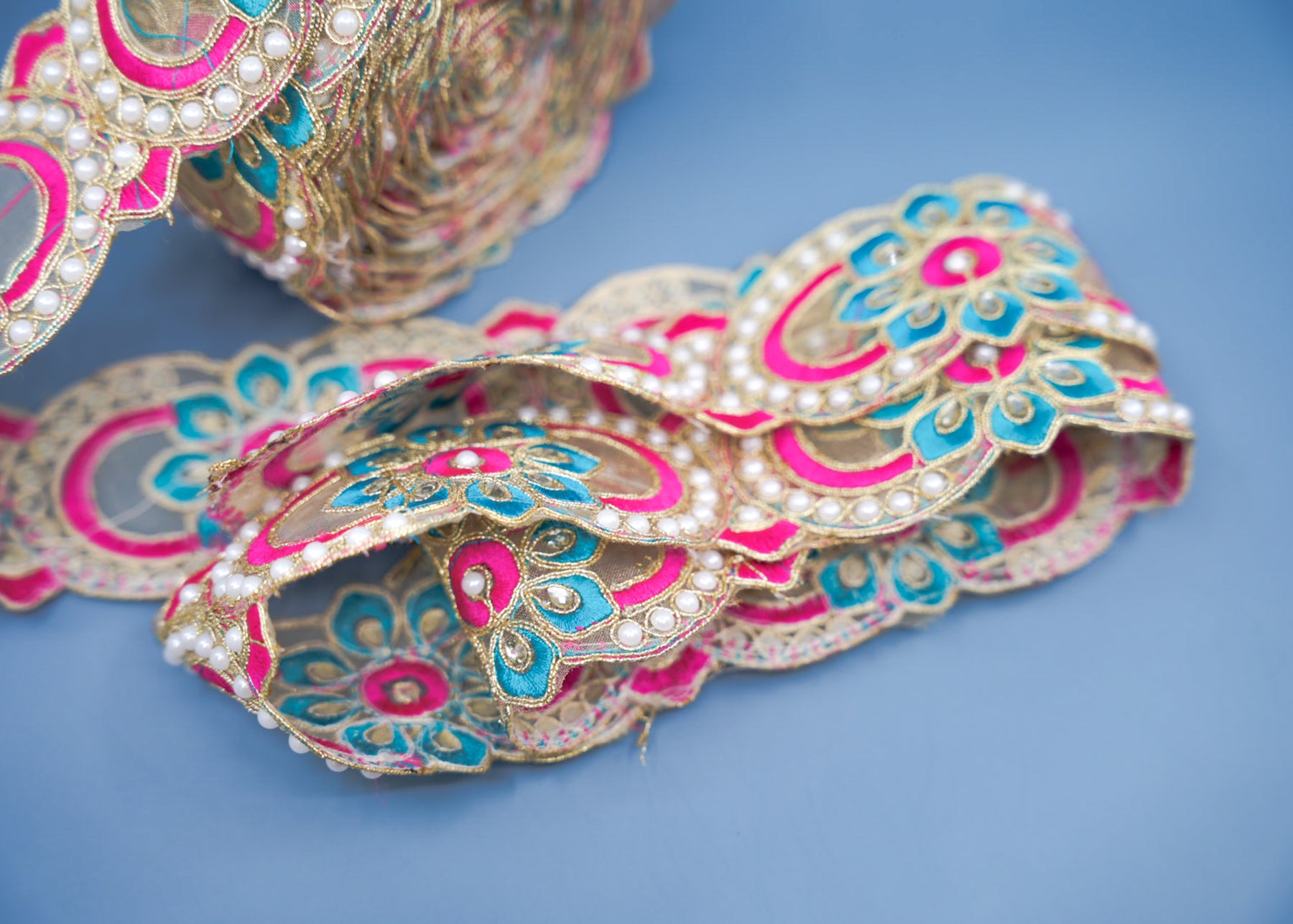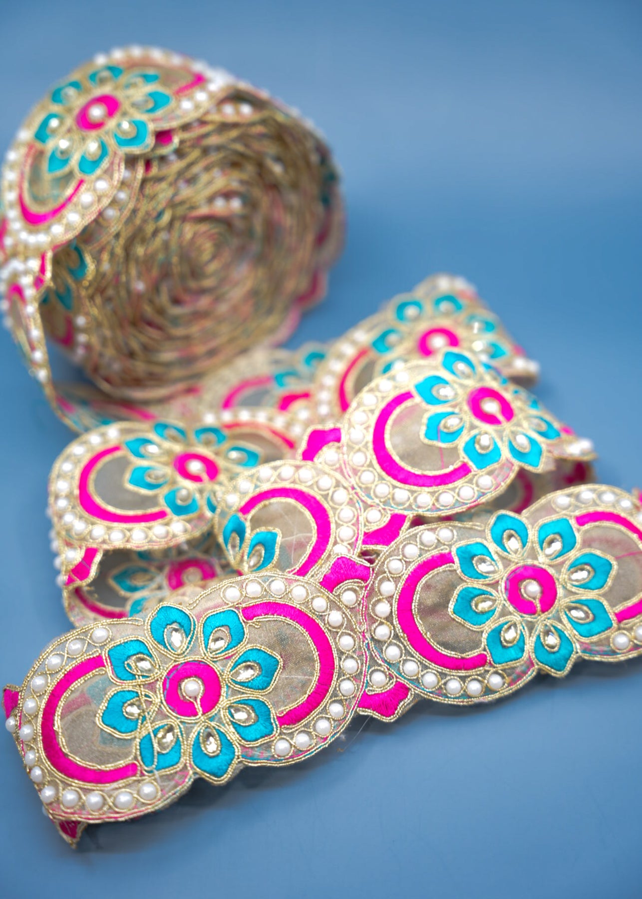 Elevate your creations with this Sheer Pink and Turquoise Saree Border Trim, featuring floral embroidery, pearl accents, and shimmering crystal embellishments. At 2.5 inches wide and sold by the foot, this delicate lace is perfect for wedding dresses, saree borders, lehengas, cultural attire, costumes, and elegant crafts.
