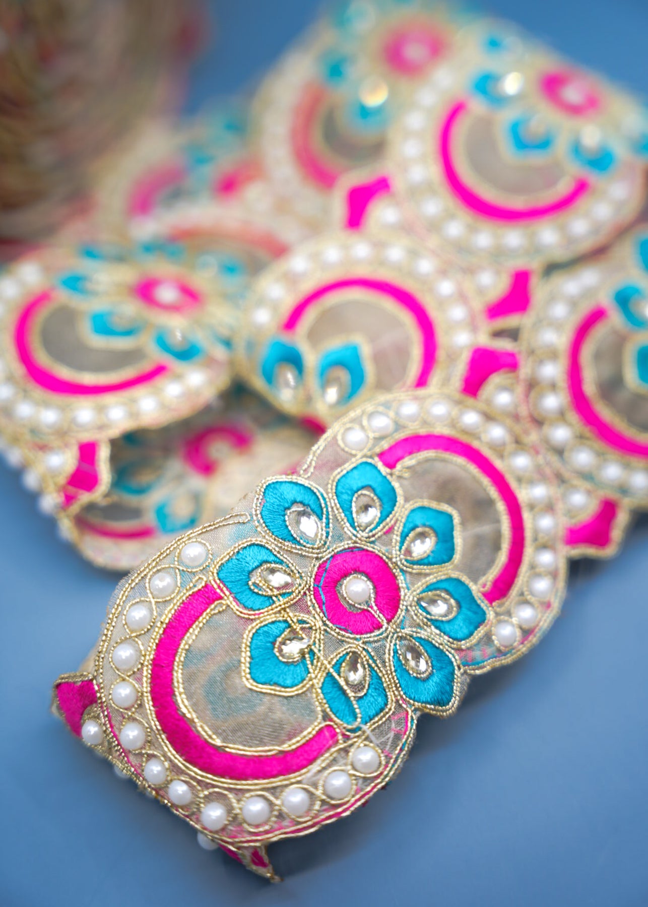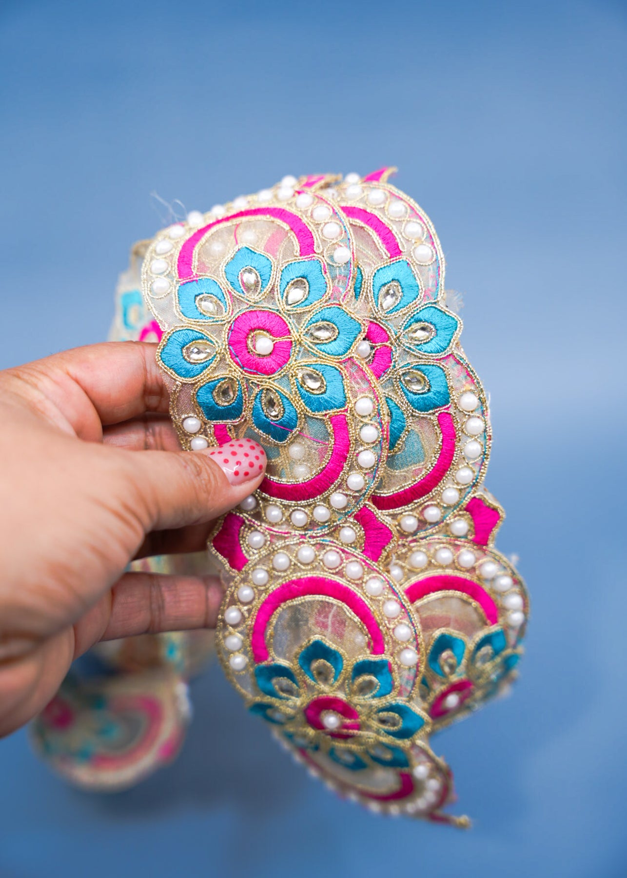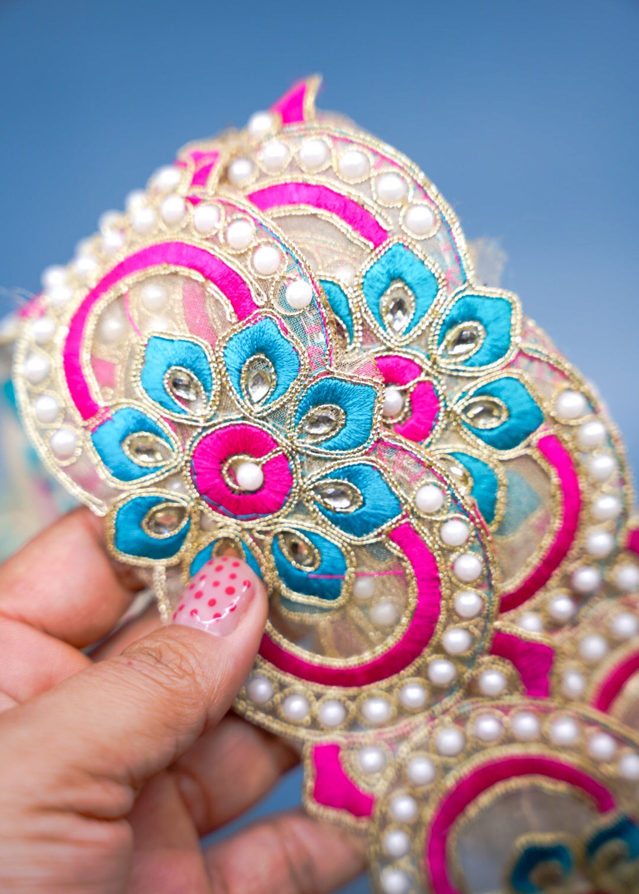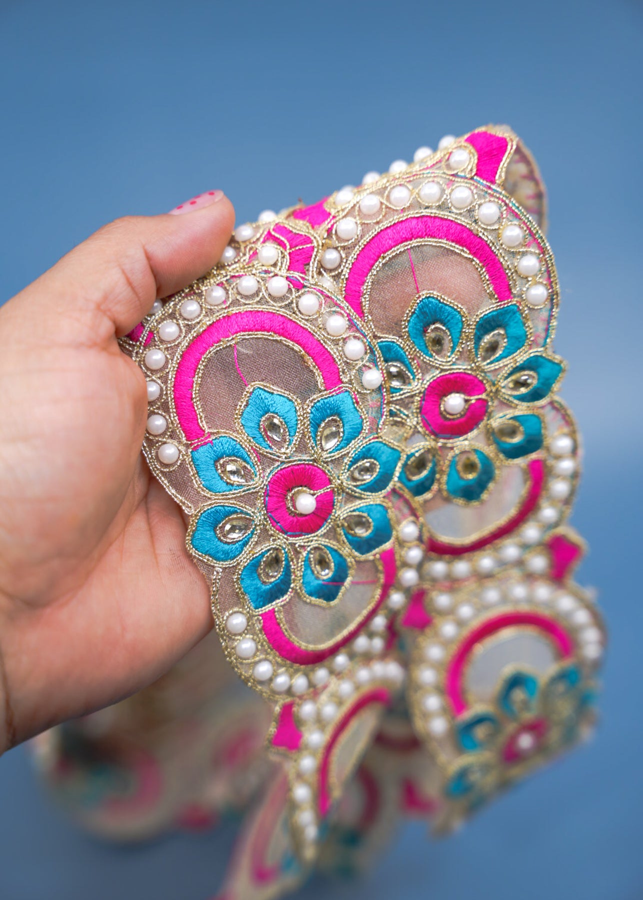 Elevate your creations with this Sheer Pink and Turquoise Saree Border Trim, featuring floral embroidery, pearl accents, and shimmering crystal embellishments. At 2.5 inches wide and sold by the foot, this delicate lace is perfect for wedding dresses, saree borders, lehengas, cultural attire, costumes, and elegant crafts.