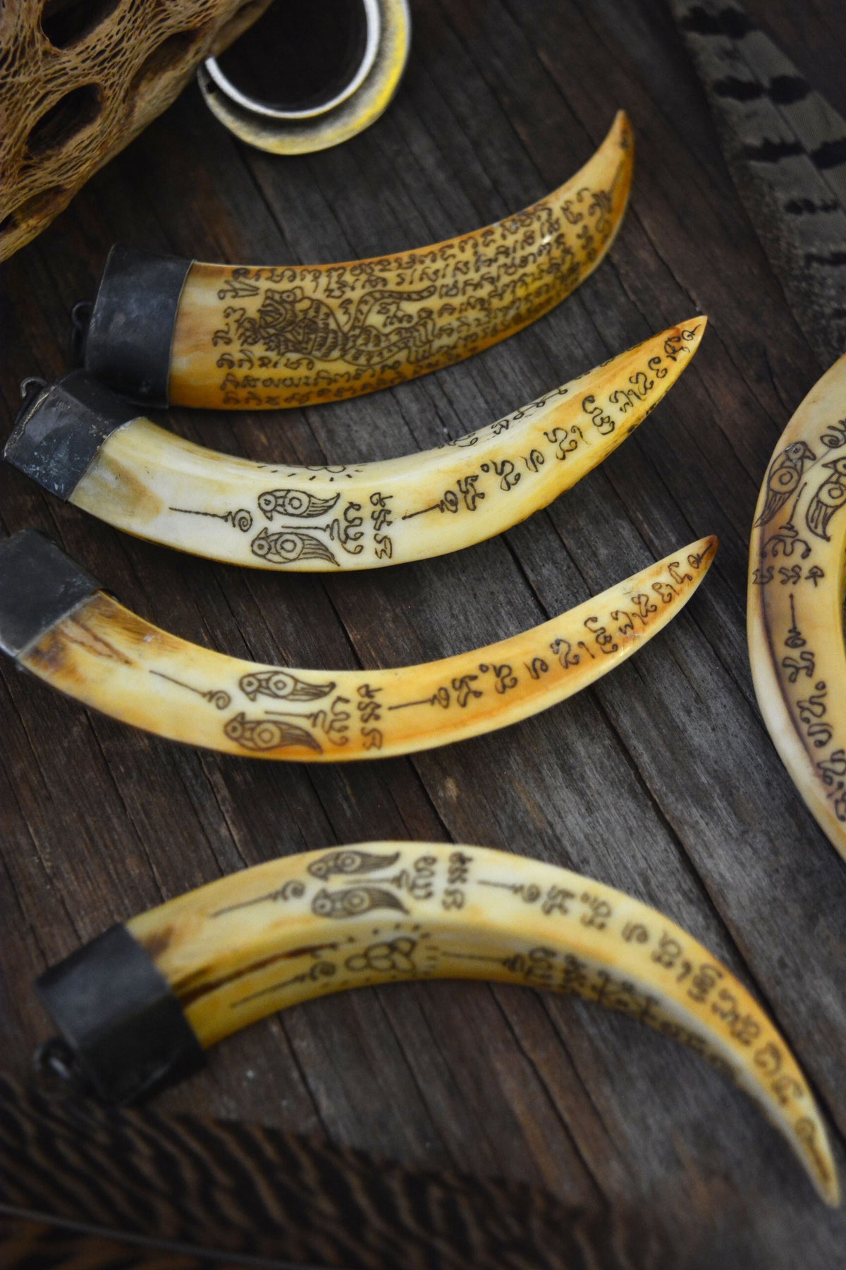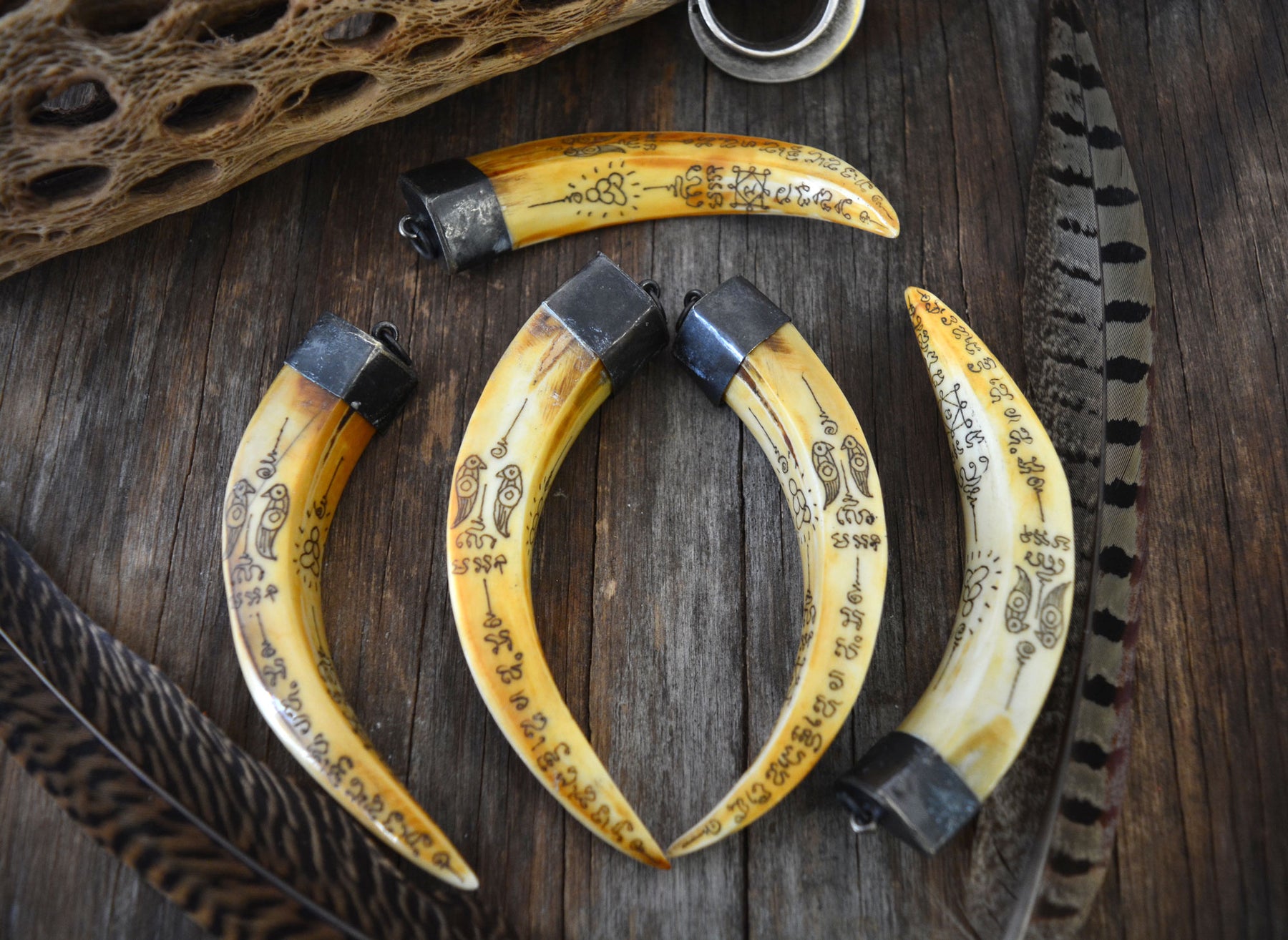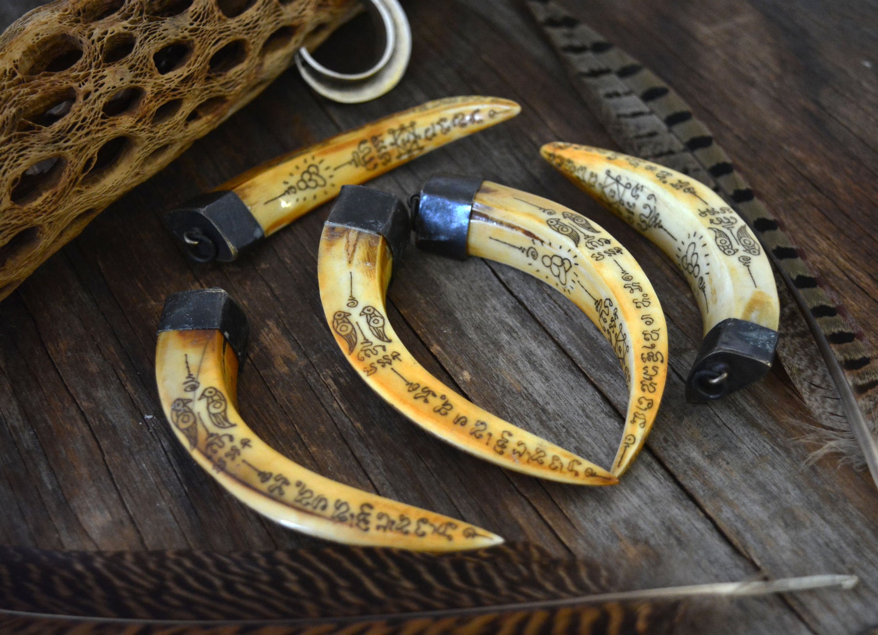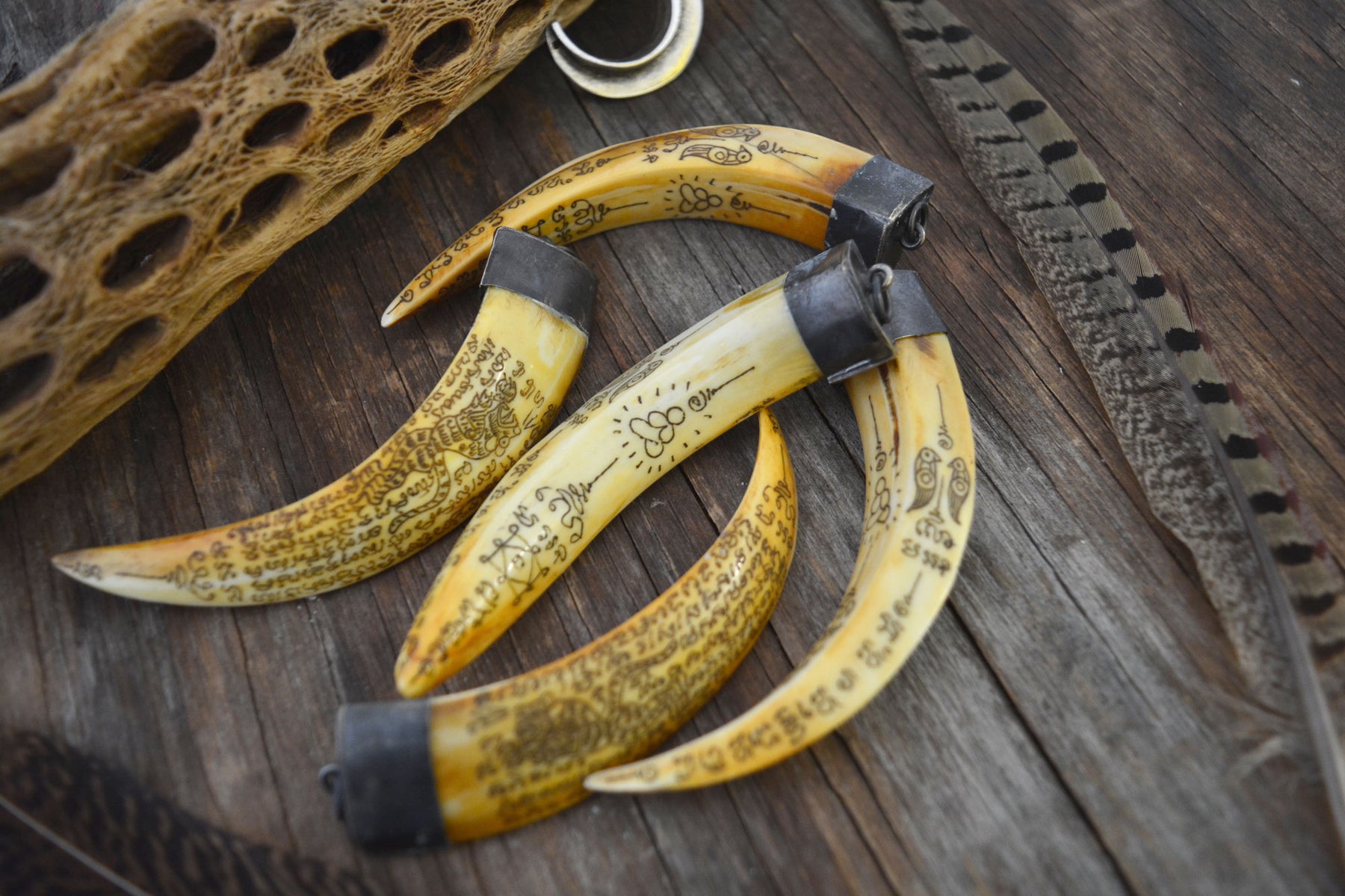 Just wait to feel the magic on these beautifully handcrafted pendants from the Himalayans, Nepal. The pieces are very well made by an artisan family and the work is top-notch. The scrimshaw is superb and the wild Boar Tusks are perfect and cruelty-free, made from recycled wild boar tusks stained with tea or natural dyes to make it look aged.
