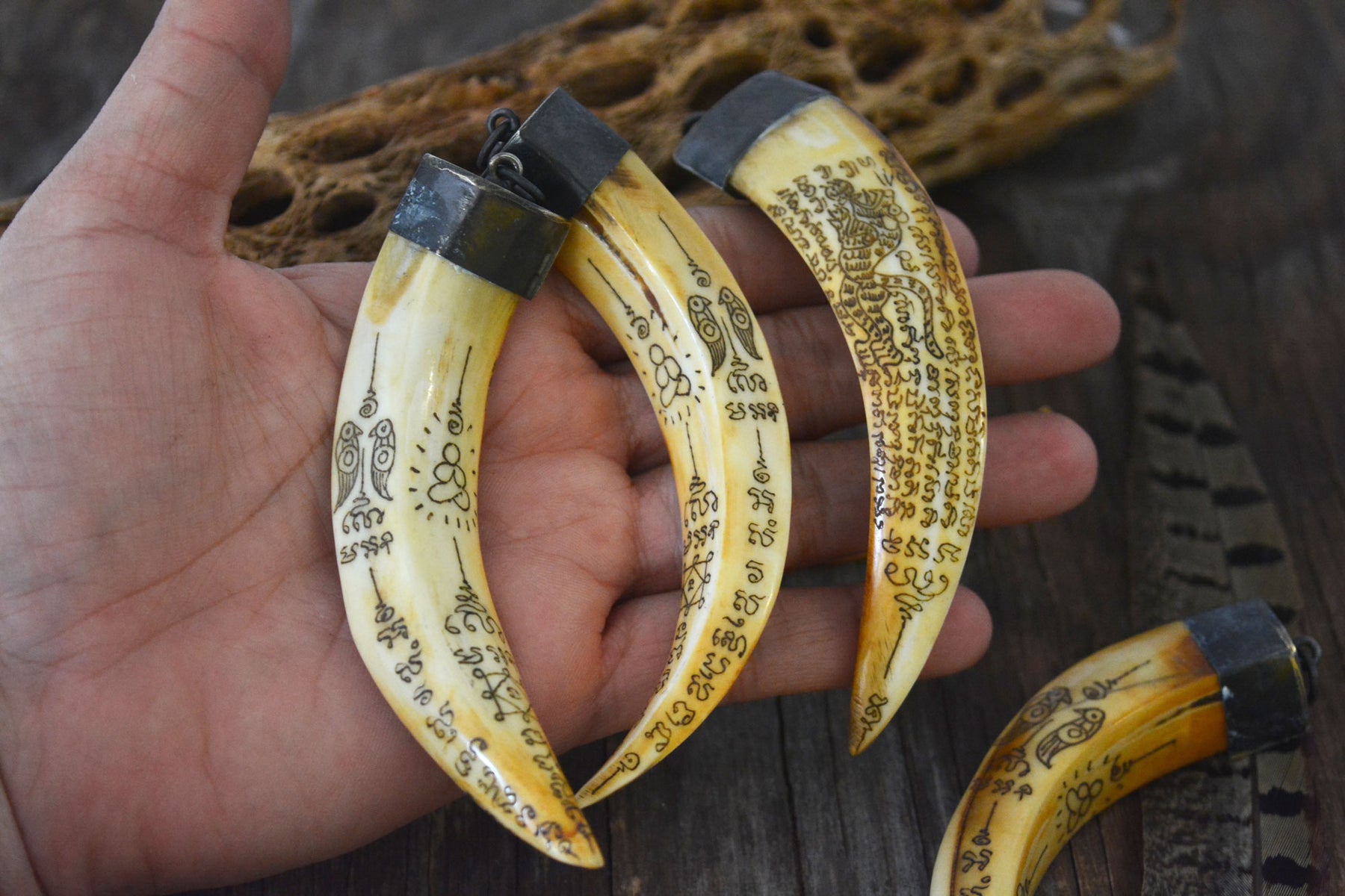 ❁ DETAILS: Material: natural wild boar tusk Size: pendants vary from one to another, they are approx. 4 inches (101mm plus) long x they are approx. 20mm wide x jump ring on top of the cap is 5mm inner diameter Variance: these are handmade, so understand that each bone pendant is unique and they will vary from one to another Quantity: 1 pendant